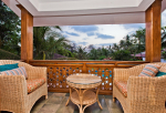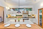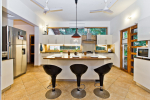 Kitchen, Dining – This holiday villa for rent has a fully-equipped kitchen with a marble-top center table. Guests can use the large double-door refrigerator, microwave, oven, kettle, and toaster. Crisp white cabinets. The dining area is just outside the living room, beside the shaded porch. There is a wet bar and a separate dining pavilion as well. The formal dining space is decorated in a sea blue and cream palette.