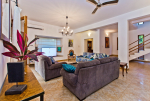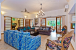 Living Room – Amalia has a huge living room. Mint and cream colored sofas, turquoise rugs, wrought-iron chandeliers, coral motifs, and elegant mirrors decorate this space. Objects of art everywhere. High ceiling allows wind and sun to flow easily. The room opens to a shaded porch with a seating area, overlooking the swimming pool, lawn, and the Caribbean Sea.