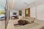 Living Room – The ground floor living room in the main house of Villa Ocean Drive is stunning. There are comfortable sofas and an antique wooden center table. Whitewashed walls. Two separate sitting areas for a big group. Large doors lead to the outside. Staircase leads to the 1st floor from one side. The study and TV-room with comfortable sitting is beside the living space.