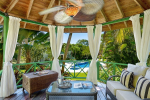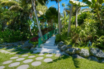 Swimming Pool – A beautiful stone terrace surrounds the hot tub and private swimming pool in this luxury villa for rent. There is a lush lawn, manicured hedges, and palm trees surrounding this area. There are sun beds and lounging spaces. The turquoise blue Caribbean Sea can be seen at a distance.