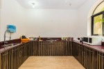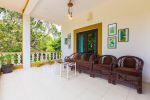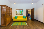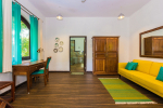 Living Room – Open-plan spacious living room with comfortable cane chairs, lounge chairs, and glass-top center table. There is a huge flat-screen satellite television. Elegant arched doors lead to the verandah with sitting that provides stunning sea views.