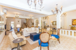 Living Room – Pass through the grand entrance hallway and you will reach the large living room of this property in Barbados. There are multiple sitting areas. The décor is traditional Caribbean style. Coral-colored walls, boutique furniture, marble flooring. High ceilings and Roman pillars. Local artwork decorates this room. There is a grand piano and pool table at one end. Grand staircase leads to the first floor.